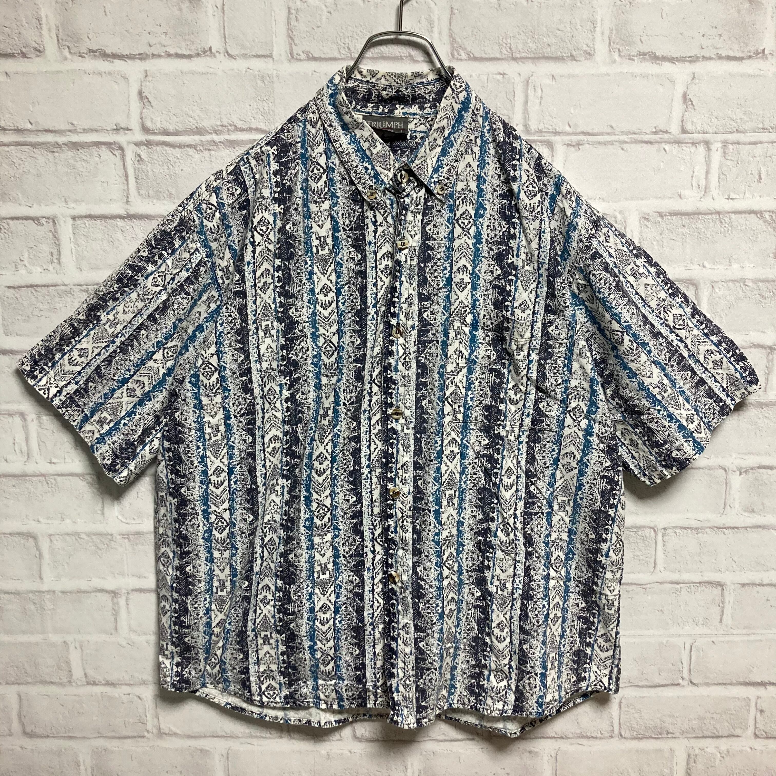 ブルー ホワイト 青 白 ネイティブパターン 総柄 柄シャツ