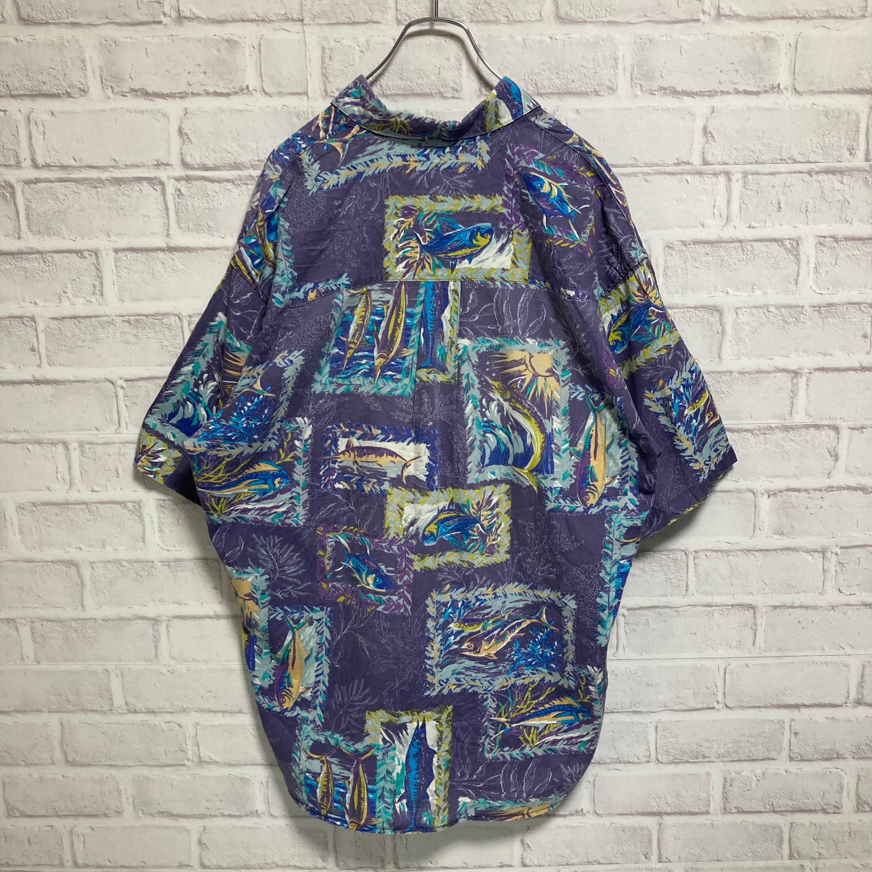 【STRAIGHT DOWN】S/S Shirt L Made in USA 半袖シャツ アメリカ製 魚柄 絵画風 油絵風 開襟シャツ オープンカラー アメリカ 古着