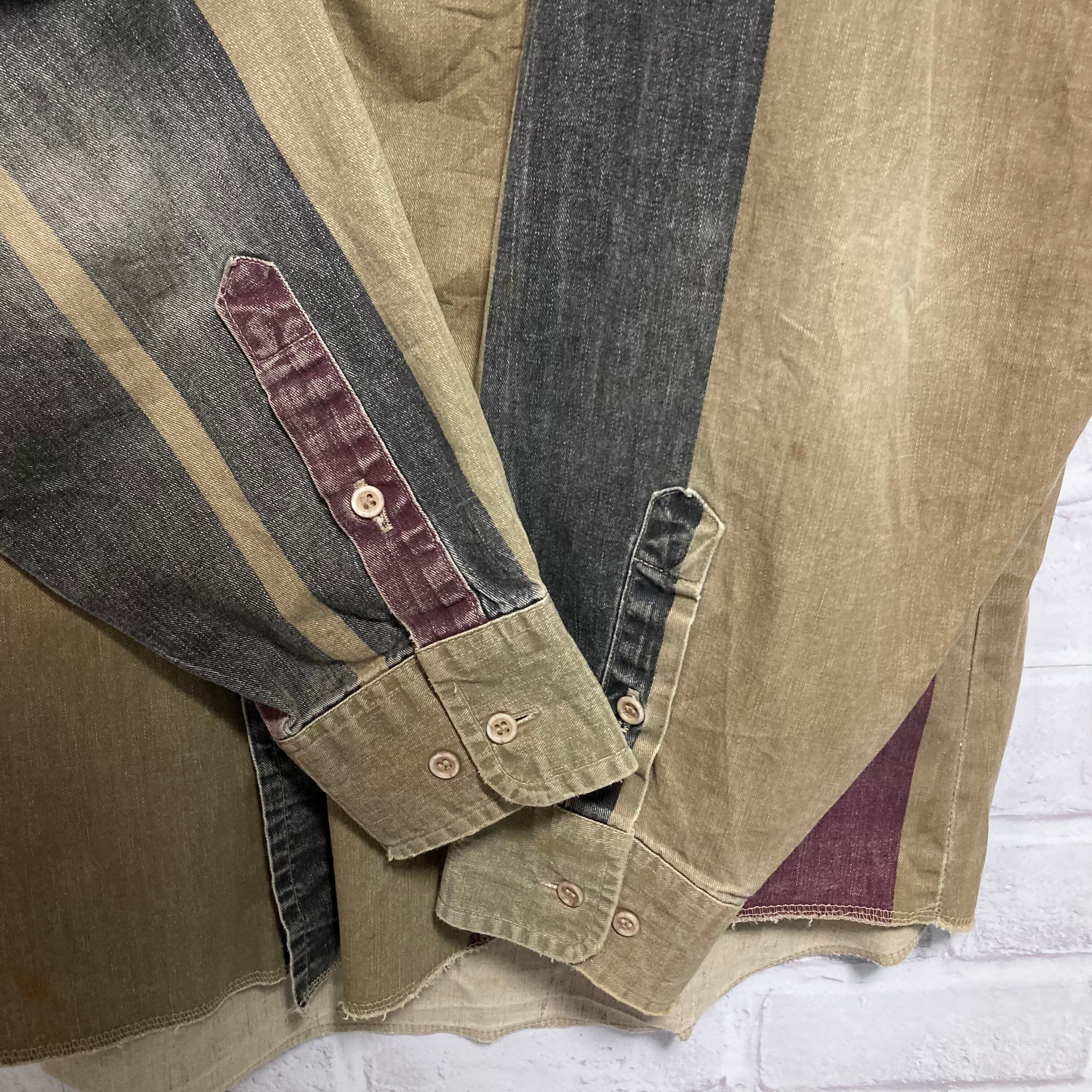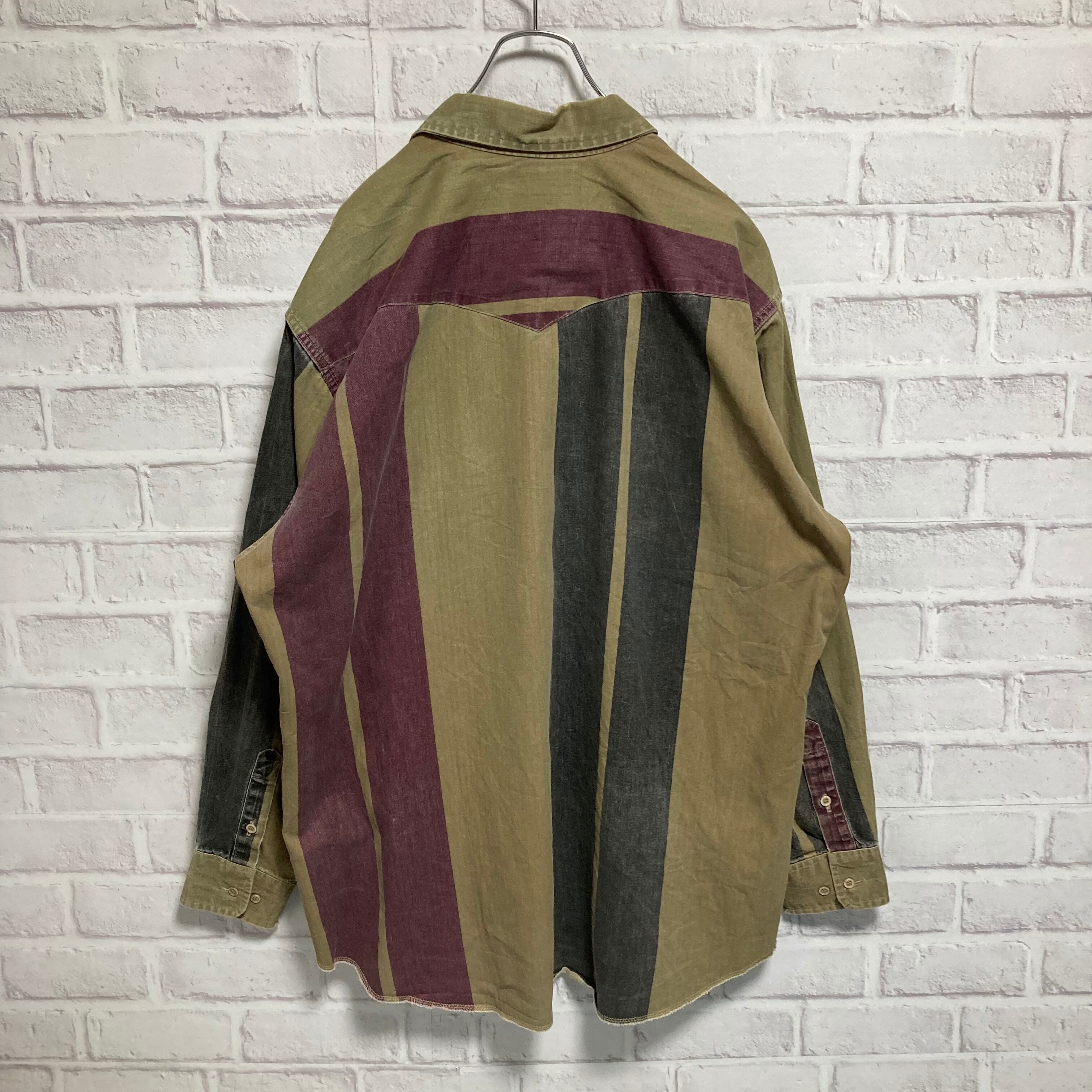 【Wrangler】L/S Stripe Shirt XL相当 ラングラー ストライプシャツ 太ストライプ オープンカラー アースカラー ビッグシルエット オーバーサイズ ゆるだぼ 長袖シャツ USA アメリカ 古着