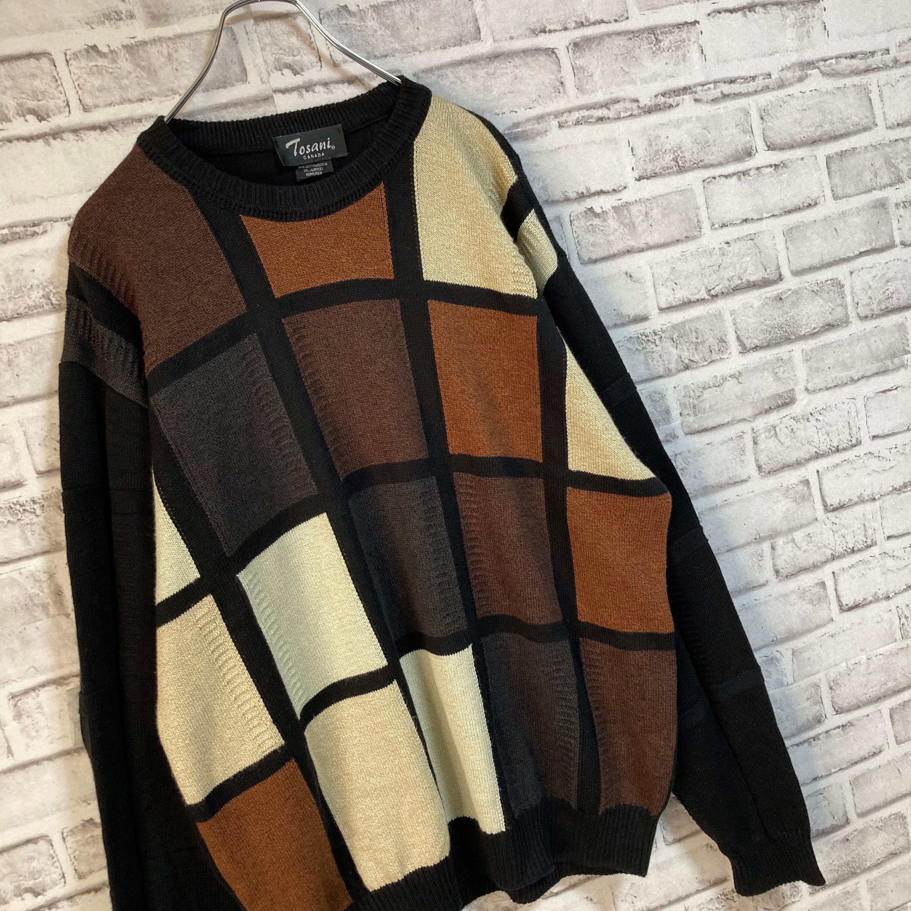 【TOSANI】Design Knit L相当 Made in CANADA カナダ製 マス目 デザインニット 総柄ニット セーター アメリカ USA 古着